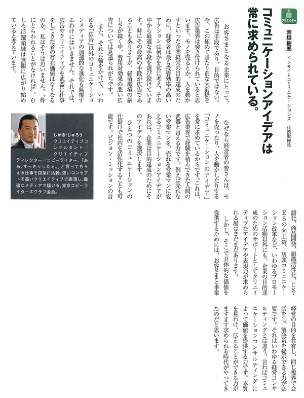 ビジネスモデルの変化を迫られている近年の広告業界が、いかに未来を切り開いていくのか。クリエイティビティを活かしながら企業の事業課題解決に踏み込む、コミュニケーションコンサルティングの重要性について紫垣の考えが紹介されています。